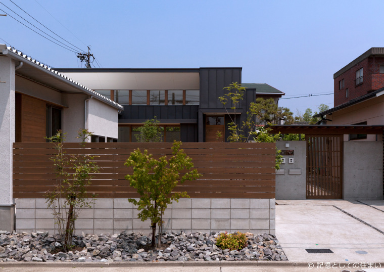 名古屋市内の住宅街の中に建つ住宅です。近隣は商業施設に囲まれた昔からある住宅街で、人通りも多い環境にあります。ご両親との敷地内2世帯住宅です。ゆとりのある敷地は大きな塀で囲むのではなく建物と塀を融合させ、敷地と道路との緩衝体として植栽で環境提供しています。