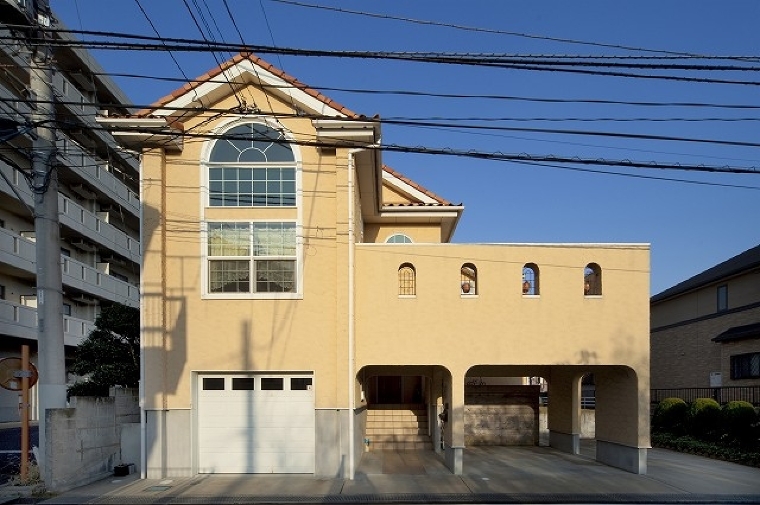 住宅地に建つ建物です。 廻りからの視線を遮るため、大きなバルコニーを造りました。 バルコニーでは視線を気にすることなく、食事をしたり出来る大きさを確保しています。 そのほかアーチ天井による間接照明等で、デザインしました。