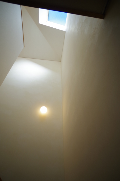 珪藻土の壁に溶け込むようなガラスの小さな照明器具。トップライトの期待感。