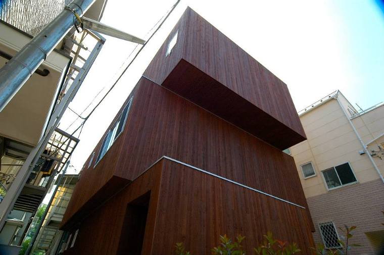 積み重なった箱は、 壁だけではなく、底面に至るまで、 木の板で覆われています...。 外観を、木にしたのには、 いくつかの理由があるのですが、 その一つは、 この地域が、昔から、 木にゆかりのある地域であったからです...。 ほんの数十年前までは、 木の板を張った家々が並んでいた、 といいます...。 今となっては、 近所では唯一と言ってもいい、 「木の家」ですが、 時間的に、少し引いて眺めてみると、 どちらが、この地域での、 当たり前のあり方、 ということになるのでしょうか...。 そういった意味では、 少々オーバーな言い方になりますが、 ミッシングリンクを埋める存在である、 という風に考えています...。