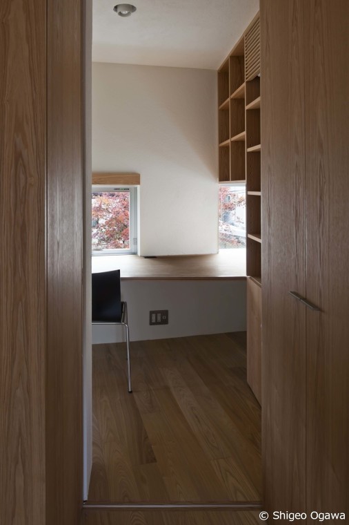 ・デスク前の小窓からは前庭のモミジを眺めることができる ・木部造作はタモ板目錬付オイルフィニッシュ仕上げ