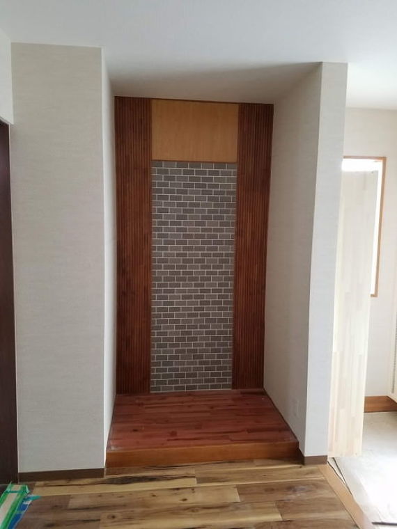 リビングダイニングからロフトを見上げた内観です。 ロフトの手摺は積層板の一枚板をくり抜いて作りました。 ロフトを支えるキッチンとの間境壁は地模様(ラフ面)のレンガ調湿式タイルで仕上げました。