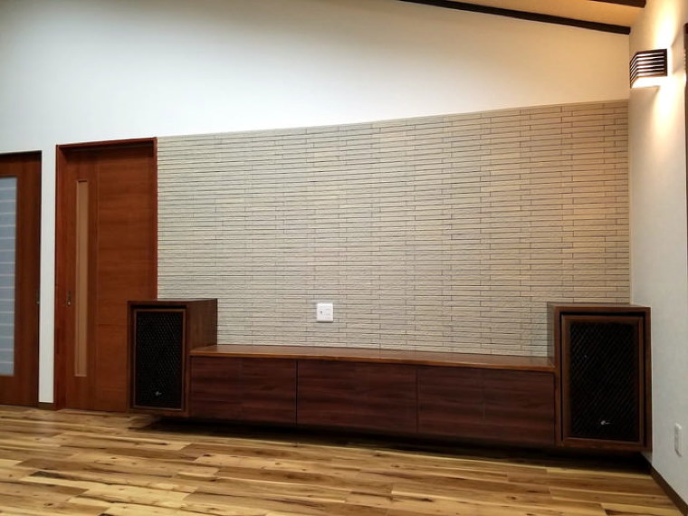 TVボードバックの壁面にタイルを張っています。TVボードを作るにあたって、お施主様が長年大切に保管されていたスピーカーを埋め込みました。 ボードの下はお掃除ロボットが通れるように13㎝の隙間を作っています。