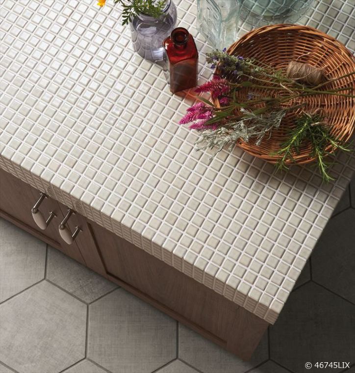 レトロな表情、色合いのタイルを混ぜ合わせました。アンティーク感のある木調家具などになじみの良い色合いです。