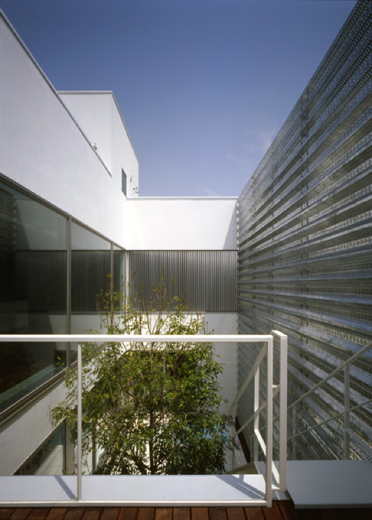 2階バルコニーから中庭全景を見る。正面のアルミ製ルーバーの奥は物干し場。