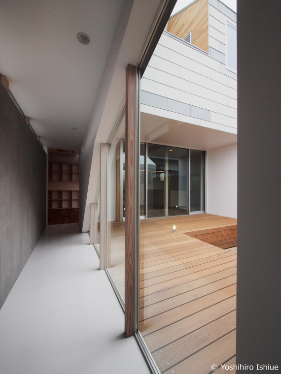 この敷地は、古い住宅地の角地に位置します。出来る限り開放的な窓を開け放して生活出来るような住宅が要望でした。そのため、中庭を2つのイエ型のヴォリュームで挟み込み渡り廊下で囲む構成を提案しています。外部から、プライバシーを確保しながら中庭に向って大きな開口をとることが出来ます。また、北側にトップライトを配置することで優しい光が空間いっぱいに広がっています。 家族が一つの空間で過ごしていることを感じれるようにシンブルとしてイエ型の屋根を採用し、個室以外をできる限り一体の空間としました。ただ、単調な繋がりを避けるためテクスチャに変化をつけています。 プライバシーを保ちながら、外部の環境を取り込む住宅です。 Copyright 2005 YIA. All rights reserved. このサイトの全ての 画像及び文章の無断転用を禁じます。