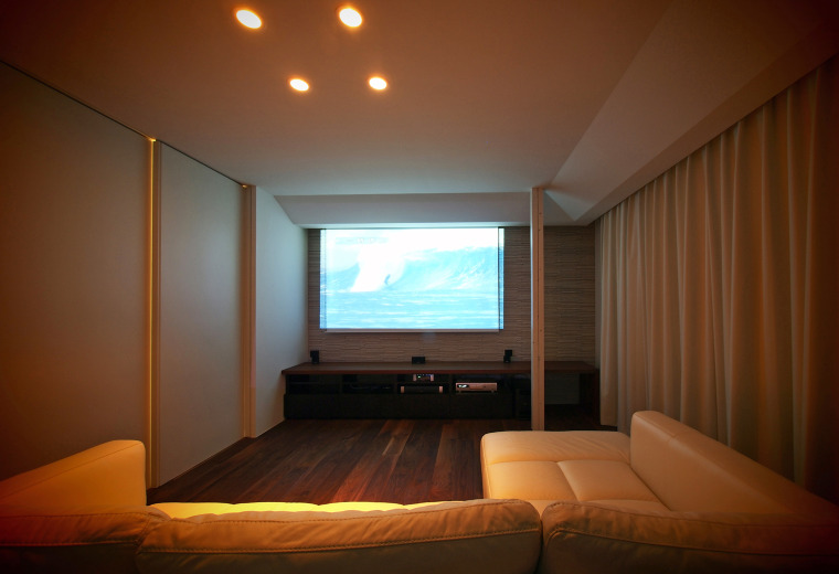 映画鑑賞がご趣味でシアタールームが欲しいとのことでした。 照明は、調光機能付きダウンライトと間接照明で雰囲気に応じて楽しめます。
