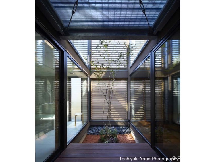 玄関正面のテラスと中庭と木製横ルーバーをみる。玄関正面に中庭を 配置することで、非日常を演出し、来客をもてなす。正面の木製横 ルーバーは視線を遮り、2階の木製ルーバーは斜めの隙間から空を望める。 ルーバーから光が差し込み、風が吹き込む。