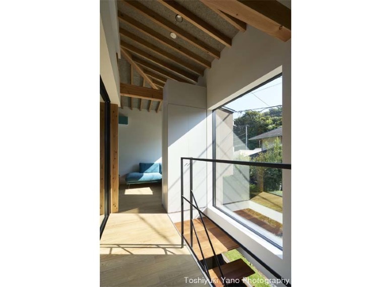 通路からリビングと階段をみる。 階段正面の収納扉高さは、サッシ高さと合せて壁は独立壁とし、 天井まで伸ばさないことで、天井の広がりを感じられる。