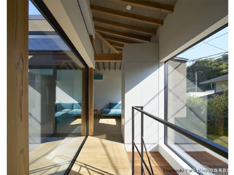 通路からリビング正面をみる。 左右の窓ガラスから外部空間や風景が映しだされ、左側の窓に虚像が写しだされている。