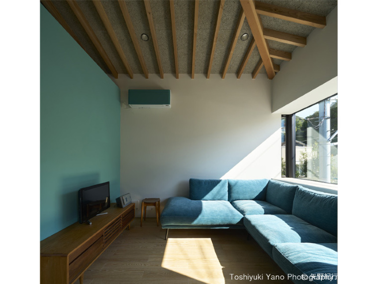 リビングをみる。左手のWICの独立壁はソファーとエアコンの色調と合せている。 東側の出窓のカウンター高さはソファーの高さに合せて奥行きを感じられるようにしている。
