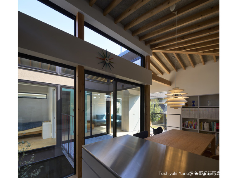 キッチンからバルコニーを介してリビングをみる。 2階天井はU字型に2階全体をつなげ、木毛セメント板で仕上げている。 垂木・隅木・梁・柱も現しにしたダイナミックな構造組を表現している。 高さ方向の開放感と各部屋の連続性より広がりを体感できる。