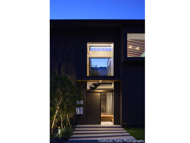 接道側から玄関アプローチを見る。2階窓から青空と山の緑を望める。
