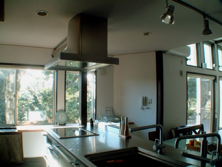 旧家の建替工事です。敷地内には樹齢300年のシイの巨木が並び立ちます。 建物はそれらに正対させる配置とし、大屋根の断面を利用して2階をスキップフロアに取った二世帯四世代の家です。