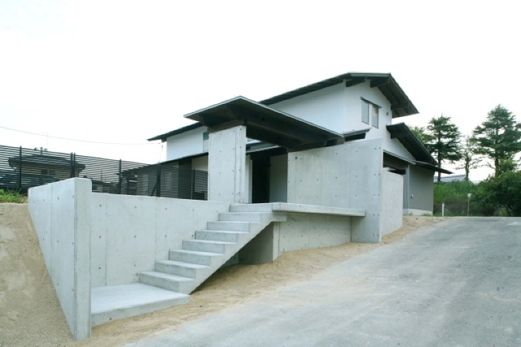 北側前面道路より2メートル上がった敷地は、逆に南側隣地の公園からは3メートル下がった位置関係にあります。 道路からの自然なアプローチを取って公園からの視線は遮りつつ、通風と採光を確保できる配置、外構、室内構成を心がけました。 日野川支流から建物を通る夏の季節風は、吹き抜けに集まる熱気を外に運び出します。屋根断熱と相まって、冷房はエアコンいらずです。