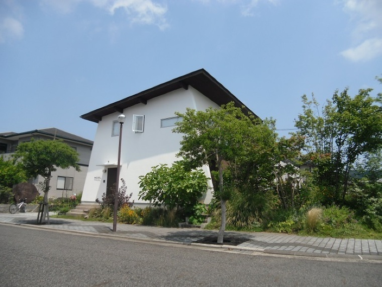 地区計画を持つ造成団地内の新築工事で、造園家であるクライアントさんとのコラボです。 シンプルな立方体の袖壁を張り出しデッキを掛けて、内部と外部、室内と庭との緩衝地帯としています。 吹き抜けは、夏は上昇気流を作って熱気を外に逃がし、冬は暖気を循環用ダクトへ導く役割を担っています。