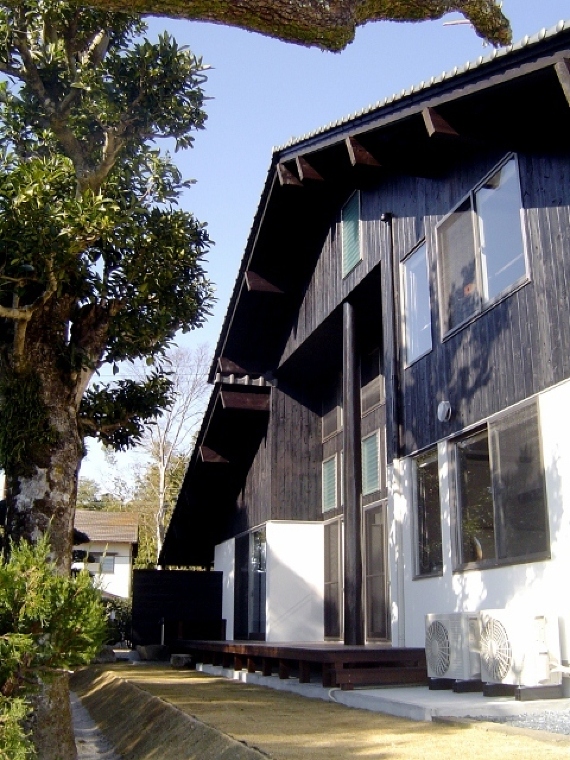 旧家の建替工事です。敷地内には樹齢300年のシイの巨木が並び立ちます。 建物はそれらに正対させる配置とし、大屋根の断面を利用して2階をスキップフロアに取った二世帯四世代の家です。