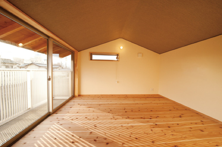 屋根勾配を活かした天井です。通常の天井高さと同程度の気積で、室内の重心をできるだけ下げることができました。