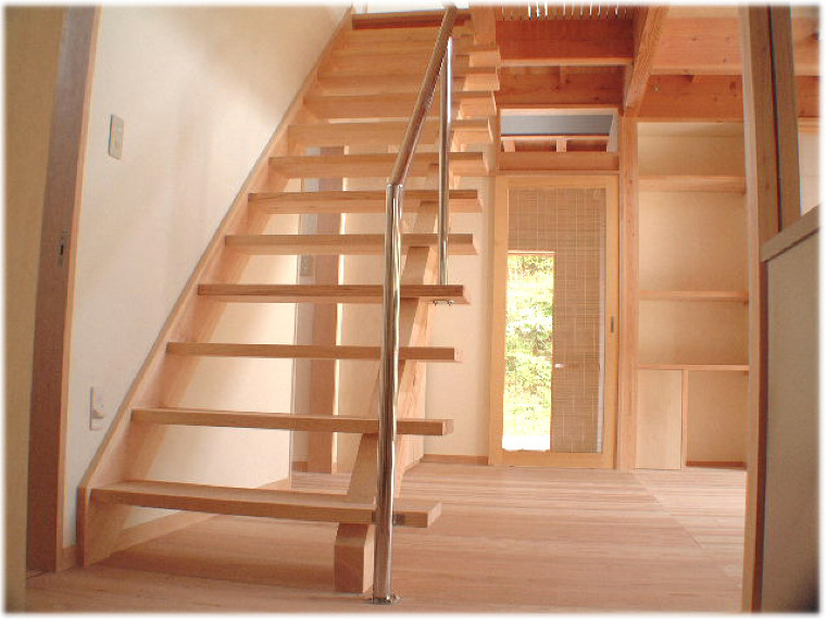 柱(マツ)、梁(マツ)、床(Jパネル)などの構造材をそのまま仕上材に用いた「木造打ちっぱなし」です。 吹き抜けを中心に光や風やご家族の気配が全体にゆきわたるワンルームの家です。