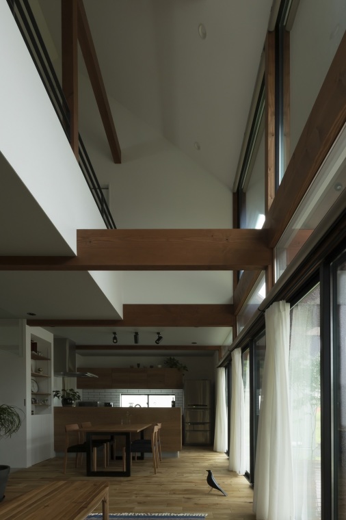ウッドデッキへ面する壁は、ガラス張りにしているので、外部から内部まで伸びた7.0mの梁が繋がって見え、より一層、内部と外部の空間を緩やかに繋げています。