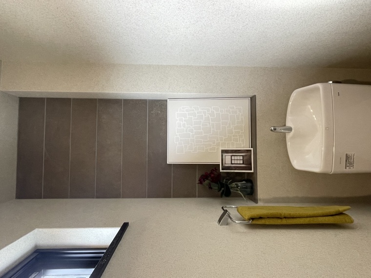 背面の壁にパイプスペースが必要でした。残りの壁面をタイル貼りで仕上げて視覚を誘導し、パイプスペースの存在感を薄める効果を狙いました。タイルの小口まで釉薬がかかっている希少な商品を採用し、天板部分も同じ仕上げに。薄い天板でスタイリッシュなトイレデザインです。