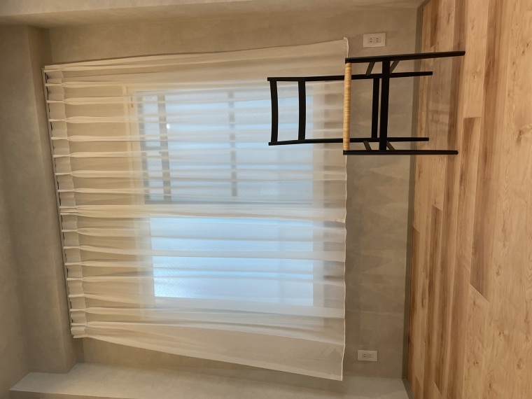 とても手触りの良い生地のレースカーテンです。窓サイズにこだわらず梁下からカーテンを吊るすことで無駄な余白を生じさせないテクニック。コンセントに重ならないように裾の高さも注意しました。レースの裾は生地をきれいに見せるようにウエイトテープ仕上げとしました。