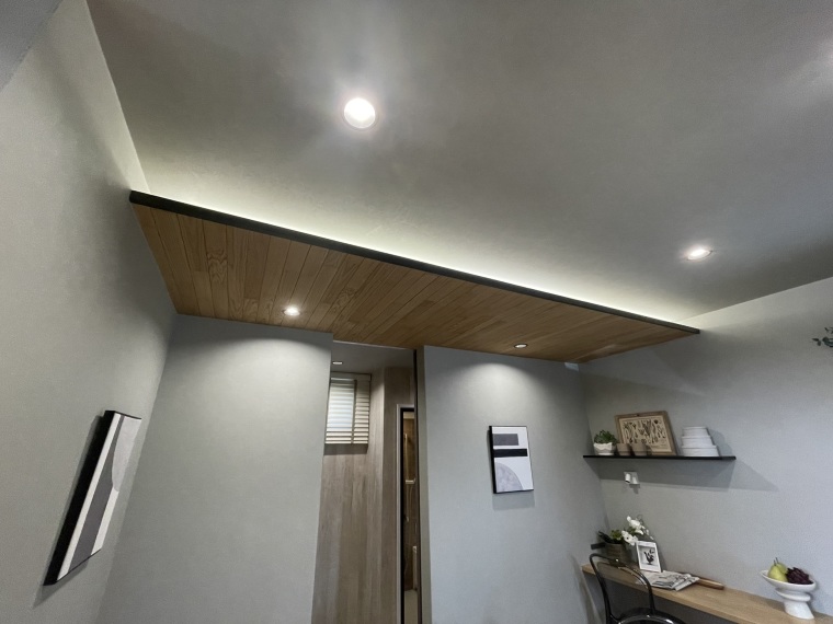 この間接照明の奥には構造上どうしても抜けない梁があります。アゴを出して間接照明とすることで意匠として仕上げました。梁底いっぱいで天井高さを確保し、そのまま洗面所へ続きますが、ハイドアを採用して一体にみえるように。開けっぱなしにしても違和感のないおさまりを意識しました。