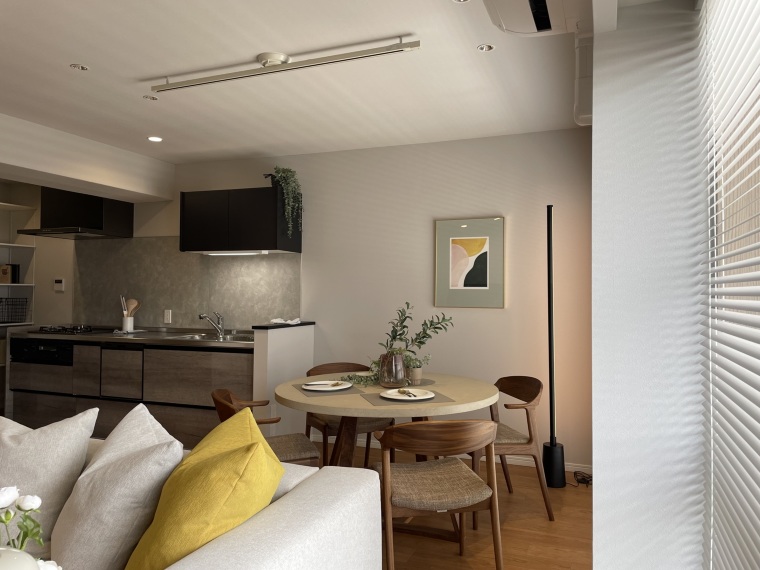 立地の良いビンテージマンションをフルリノベ。掃出窓の上部の梁を丸ごとカーテンボックスのようにして空間ノイズを少なくスタイリッシュに仕上げました。
