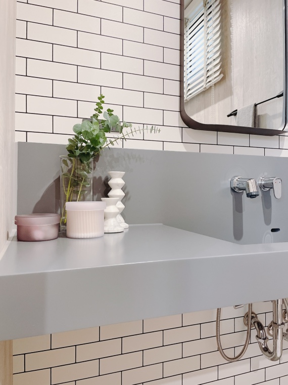完成したら小物までコーディネートします。実際に洗面台を使うシーンがイメージできるようにアイテムやカラーテイストを整えます。