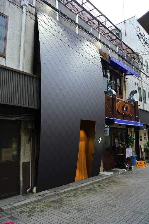 大阪福島駅で寿司屋の計画です。簡素だけれども上質で、あくまで主役であるお寿司が最も美味しく映えるような空間を提案しました。 外観は既存建物の形状に添って弓なりに湾曲させた、チタン亜鉛合金の菱葺きとしています。