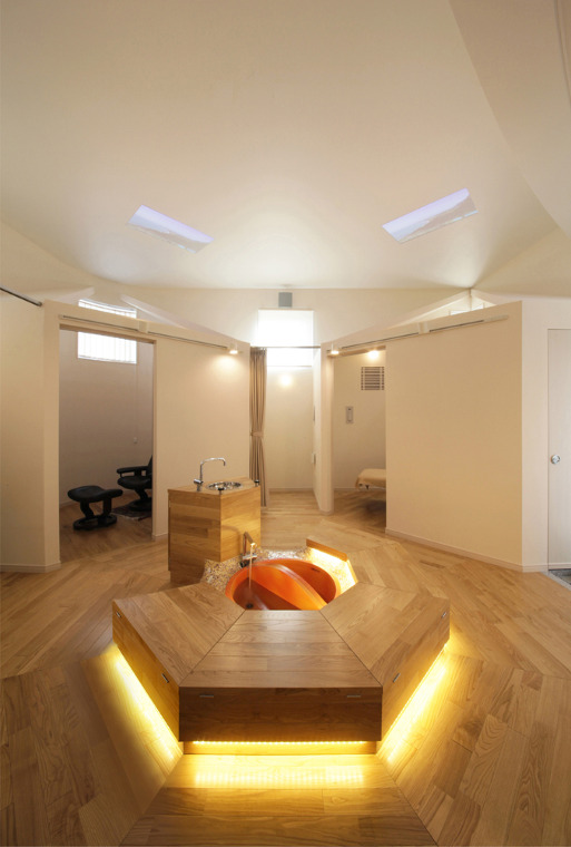 東京都足立区の鍼灸院です。 足湯・映像・BGMを駆使し、癒しと楽しさを徹底的に追求する、地域に開かれたサロンを目指します。 八角の足湯のある待合を中心に治療室が入れ子状に配置されています。 映像は施主撮影の癒しの環境系BGV。天井に3ヶ所照射し、待合だけでなく治療室からも映像を堪能できます。 水にもこだわって活水器を導入し、肌の弱い方にも気配りの徹底ぶりです。 インテリア雑誌『 ホワイエ 』( 2013年秋号 )掲載