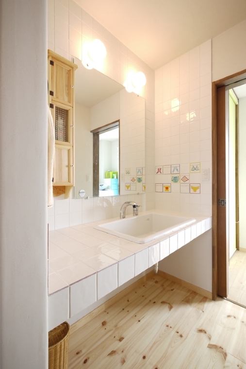 シンプルな洗面台。サイドにはかわいらしい手描き風タイルを貼っています。