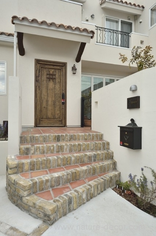 雑貨屋さんのようなお家 住宅ポーチ 存在感のある玄関ドアは古材を使って再生されたメキシコのもの。 錆びた金物の風合いと木の質感は、玄関にインパクトを与えます。