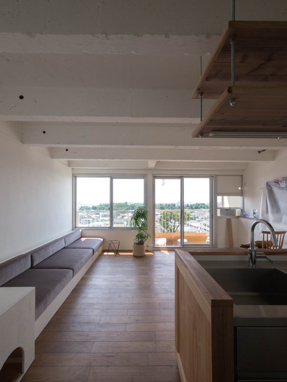 周囲に高い建物が無いためすばらしい眺望が得られます。これも中古マンションのリノベーションの利点です。キッチンをバルコニー側へ向けて料理中も外の景色を楽しめるように配慮しています。