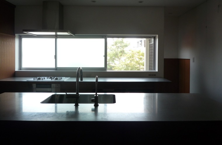 1967年に竣工した大分市内のRC造の戸建住宅のキッチンの改修です。 明るくて、居心地が良くて、家族との対話が生まれる場、 茶道の生徒さんとのお茶事の際、水屋に隣接する共同作業の場としてのキッチンが求められました。 北側の庭に面した大きく水平にひろがる窓からのやわらかい光が、キッチン全体の空間をつつみます。 カウンター前の開口部から眺める様々な樹種の庭木や植物の日々の変化に、季節の移ろいを感じます。 オープンになったキッチンは、居間にいる家族との関係性も生まれ、そのむこうの南側の庭の景色を愛でることが出来ます。 凛としていながらも、あたたかみのある空間を目指しました。