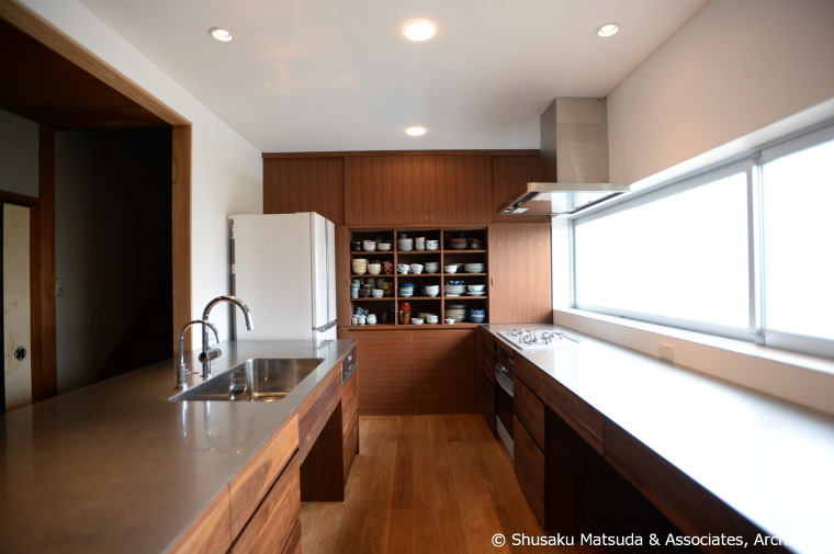 1967年に竣工した大分市内のRC造の戸建住宅のキッチンの改修です。 明るくて、居心地が良くて、家族との対話が生まれる場、 茶道の生徒さんとのお茶事の際、水屋に隣接する共同作業の場としてのキッチンが求められました。 北側の庭に面した大きく水平にひろがる窓からのやわらかい光が、キッチン全体の空間をつつみます。 カウンター前の開口部から眺める様々な樹種の庭木や植物の日々の変化に、季節の移ろいを感じます。 オープンになったキッチンは、居間にいる家族との関係性も生まれ、そのむこうの南側の庭の景色を愛でることが出来ます。 凛としていながらも、あたたかみのある空間を目指しました。