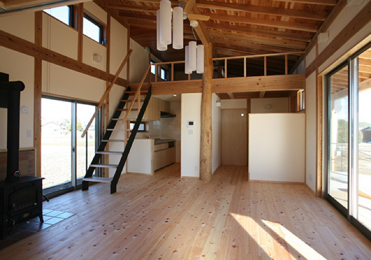 北側の田圃から南のウッドデッキを通して気持ち良く風が流れます。 暖房は薪ストーブ、贅沢な暮らしとも言えるし、不便な生活でもあります。