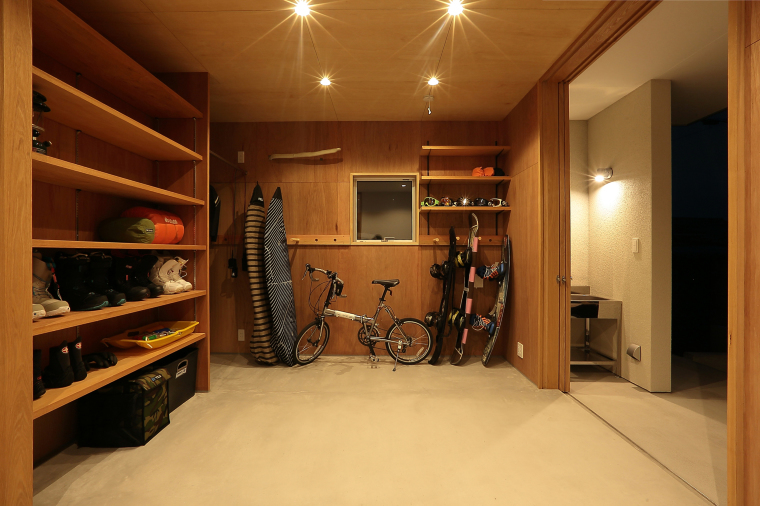 ご主人の趣味はスノーボードやサーフィン。 車への搬出入も考慮し駐車スペースから近い位置、そして濡れたままでも気兼ねなく持ち込めるよう玄関続きの土間空間として趣室を設けました。