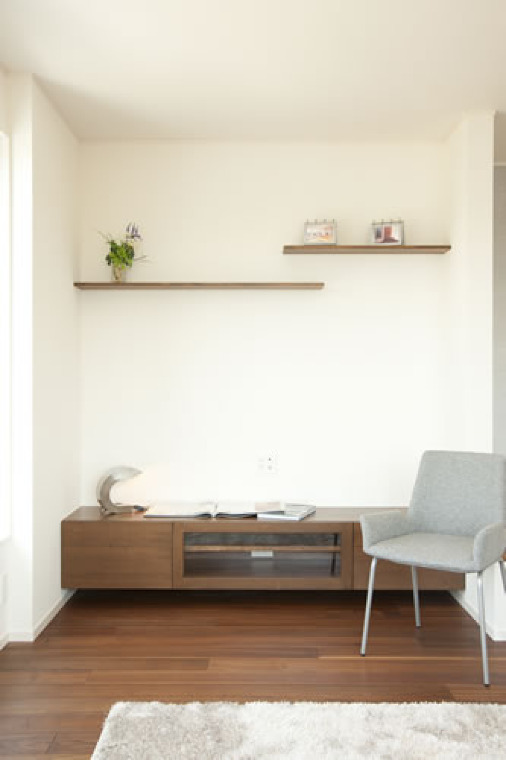 ガラスとモザイクタイルで出来た飾り棚や、下に収納の付いた畳コーナー。TV台も弊社大工で作りました。
