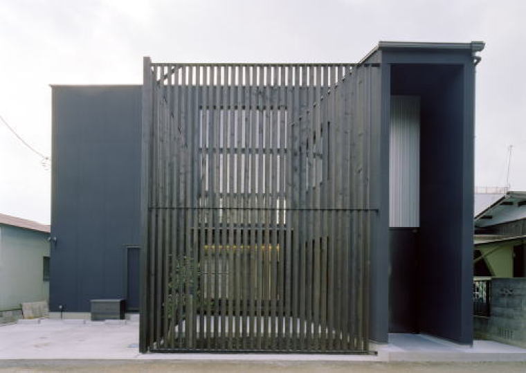 北側には道路があるため、2階まである縦格子を設置し、その中に山紅葉と銀杏を植えました。