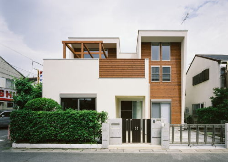 ■建物概要 扇町の家/敷地面積 138.49㎡/建築面積 74.36㎡(22.49坪)/延床面積 117.51㎡(35.54坪) 木造2階建て 一戸建て住宅 ■神奈川県小田原市、およそ25年前に造成された住宅地の中に建つ家。 御母堂様が住むご実家を建て直し、息子さんご家族が同居すると言う計画でした。 そのため御母堂様の生活リズムと、お孫さんたちとの生活リズムの接点と切り離しを考慮し、それそ゜れに気兼ねしない関係性を大切と考えた家です。 敷地目一杯に建物が建つため、リビング上部に大きなルーフバルコニーを設
