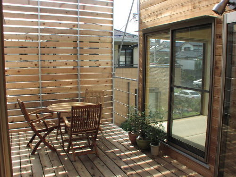 2階リビングに接して設けた木製デッキ。木製スノコと外壁の板張りが、落ち着いた雰囲気を感じさせてくれる。外部と緩やかに閉じた場所。