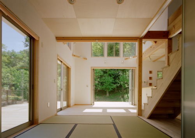 畳みの敷かれた場所とフローリング敷きの居間との間に段差は無い。けして広くは無い空間だが、外との繋がりが開放感を感じさせる。