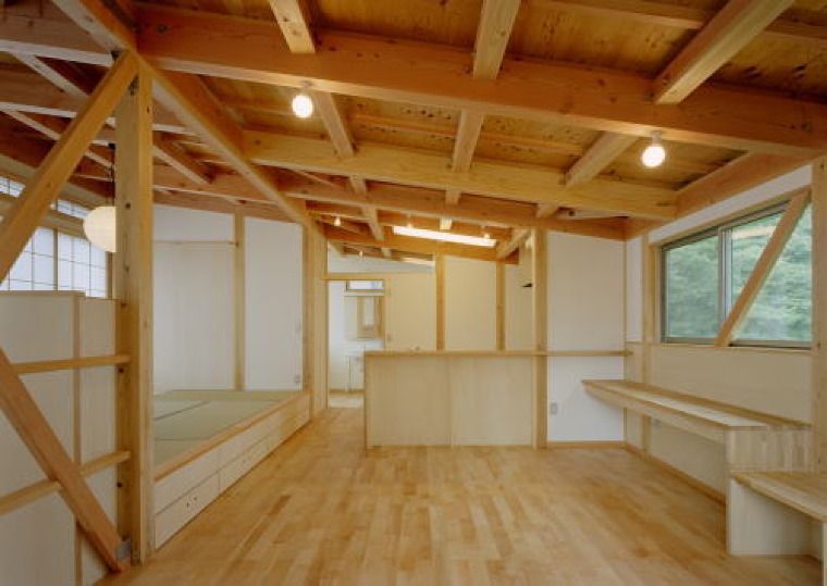 広いダイニングには、大きめのテーブルが置かれている。正面の壁の向こうには流し台が設けれ、右側には山の景色を望める、大きな窓のある長いカウンターを設けている。ここで本を読み、PCを開き、勉強をする。子供の勉強部屋であり、父の書斎であり、母の趣味の部屋でもある。