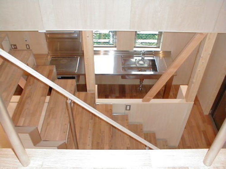 化学物質を嫌い、ハウスダストを避けたいと考えた家は、結果的に掃除のしやすい家になりました。階段のフレームは塗料を塗りたくないのでステンレス製としました。流し台もステンレス材だけで造られた一品製作物。シンプルですが拘った物。