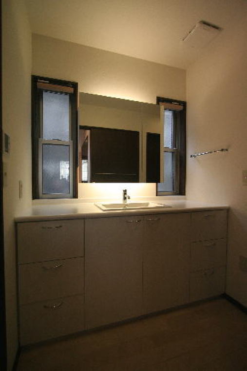 「ホテルのような」を、イメージに製作した洗面化粧台。細々とした物を見せることなく、大きな鏡の裏全部を収納にした。照明器具も見せることなく煩雑になりがちな場所をスッキリさせる。