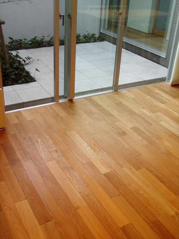 ●湿度によるフローリングの膨張に備え、ジョイント部には「名刺1枚(0.3mm)程度」の隙間をとって貼り、壁際やサッシ・敷居などにも密着させずに5mm以上のクリアランスを確保して、幅木やコーキングなどで処理してください。