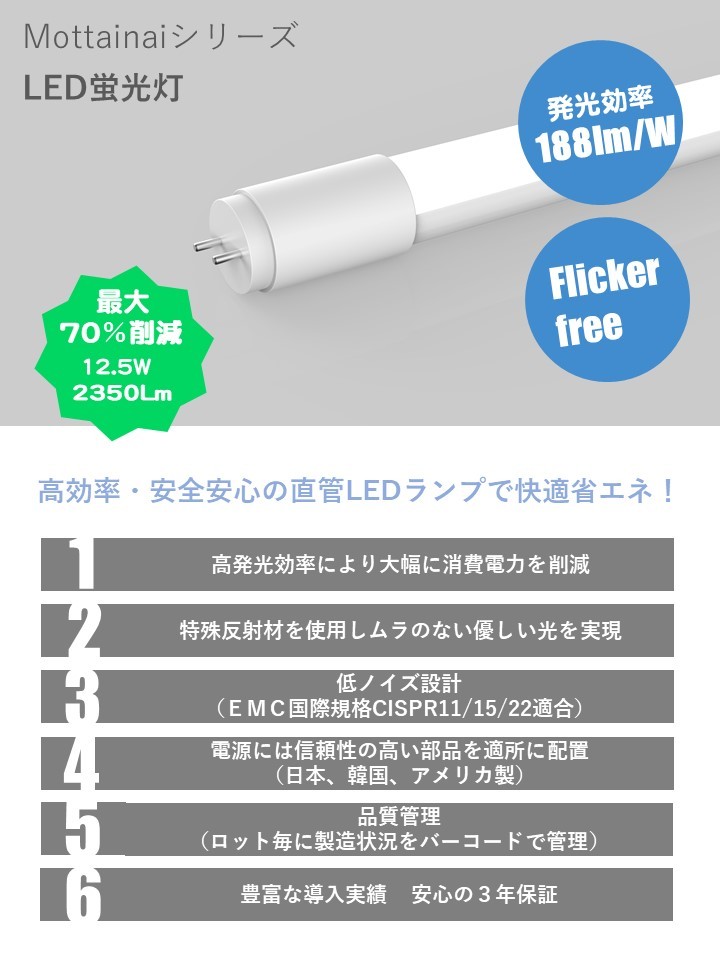 ◆発光効率:最大188lm/w、業界トップクラスの高発光効率で大幅に消費電力を削減します。