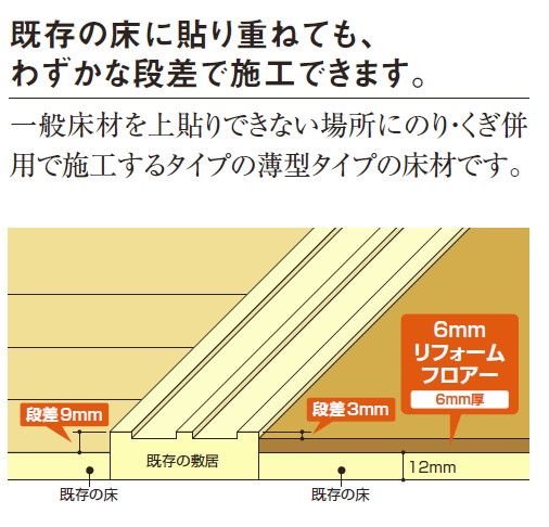 で販売しています。リフォームにおすすめの薄型の床材です。 既存の床に貼り重ねても、わずか...