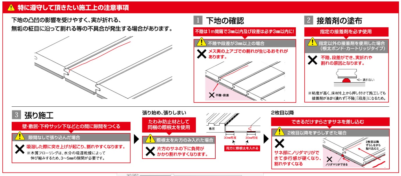 ●床材の継ぎ目部分がすれて床鳴りがする場合があります。このほかワックスや表面コート剤の塗布、下地条件などにより、音が発生する場合があります。